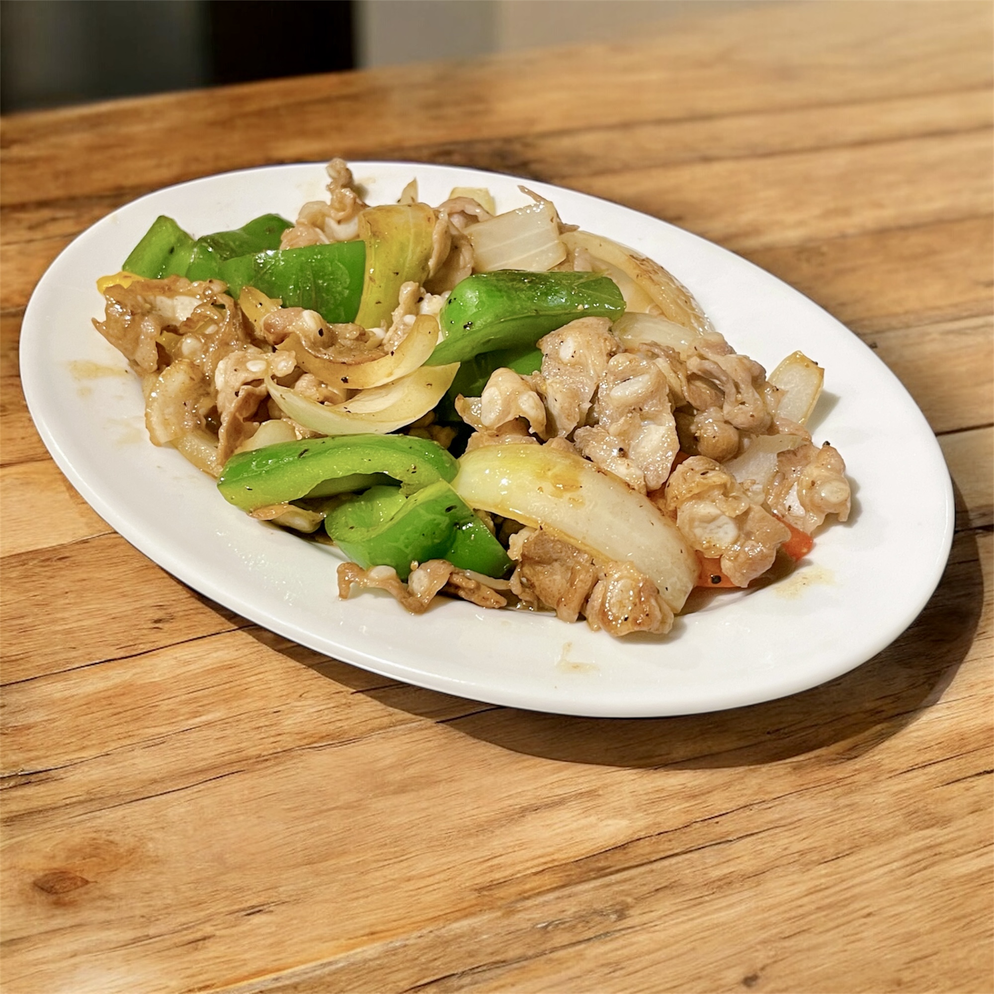 コリコリとした食感の豚軟骨スライスとピーマンをスパイスとポン酢でソテーしました♪