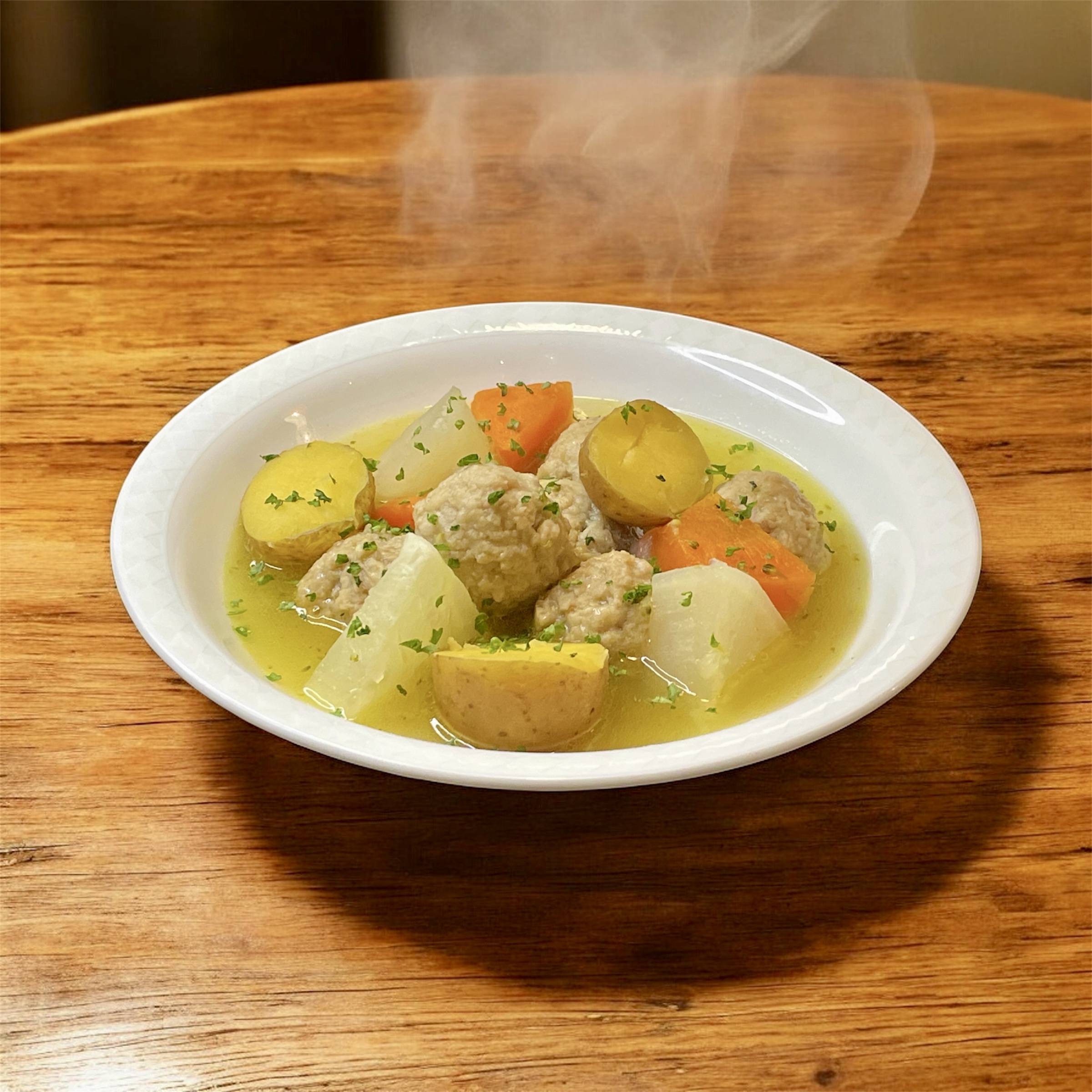 ミートボールと大根、にんじん、ポテトをじっくりコンソメ仕立てで煮込んでます♪
