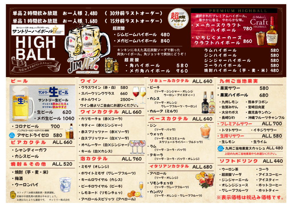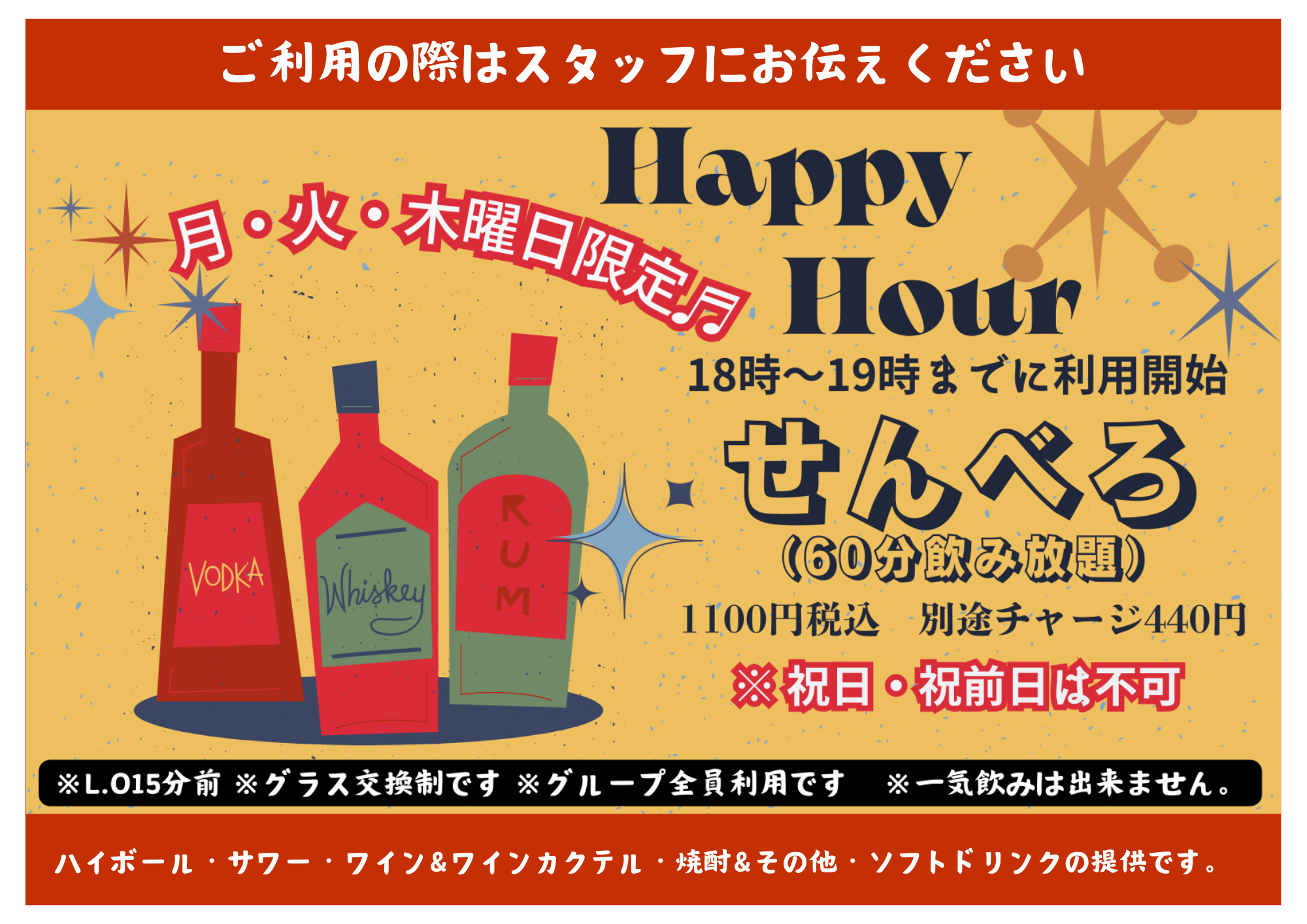 L.O15分前・グラス交換制・グループ全員利用・一気飲みは出来ません。