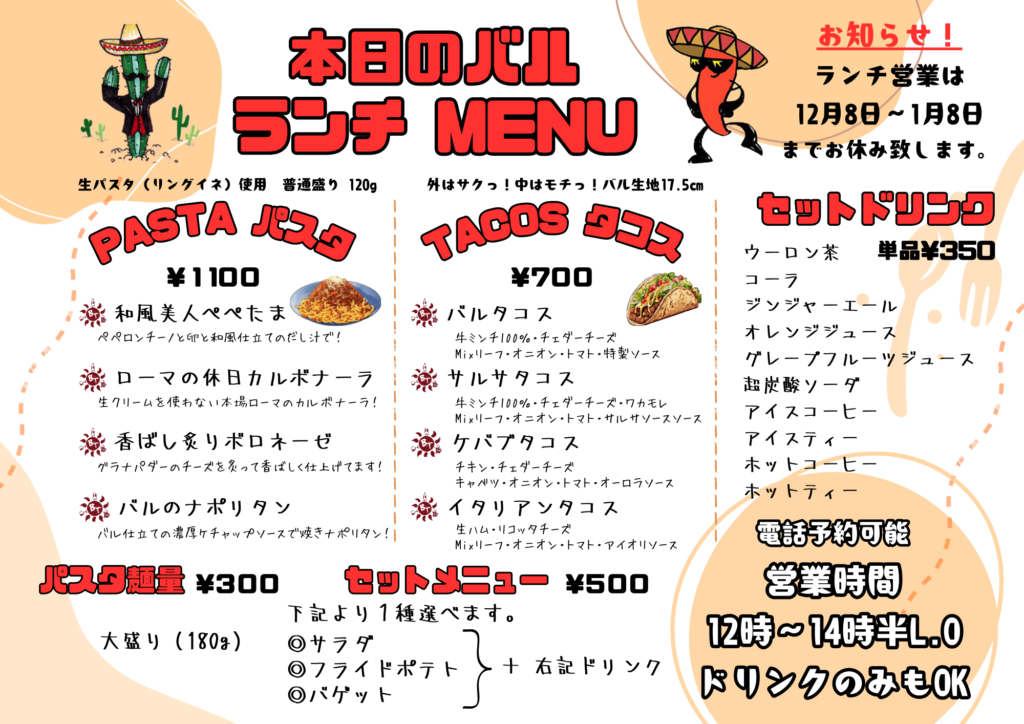 | 営業時間 | 月、火、木、日、祝日:18:00~翌0:00(料理L.O. 23:00 ドリンクL.O. 23:00) 金、土、祝前日:18:00~翌1:00(料理L.O. 翌24:00 ドリンクL.O. 翌24:00) |